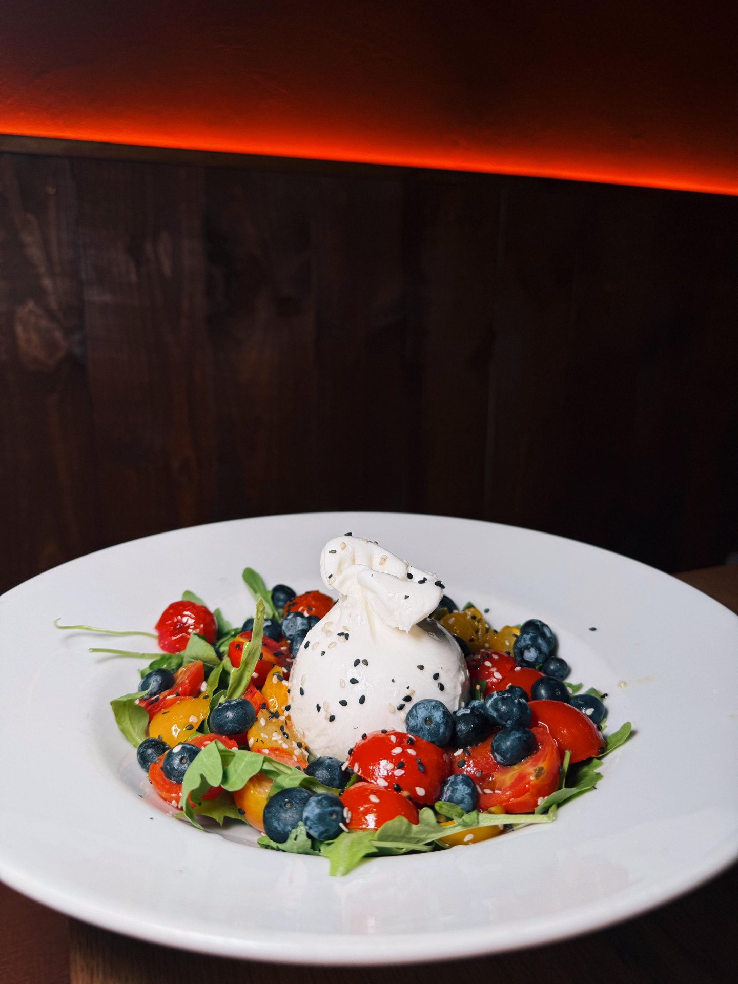 Pan artesanal, salmón ahumado, aguacate y queso philadelphia, decorado con un toque de sésamo y rúcula.
